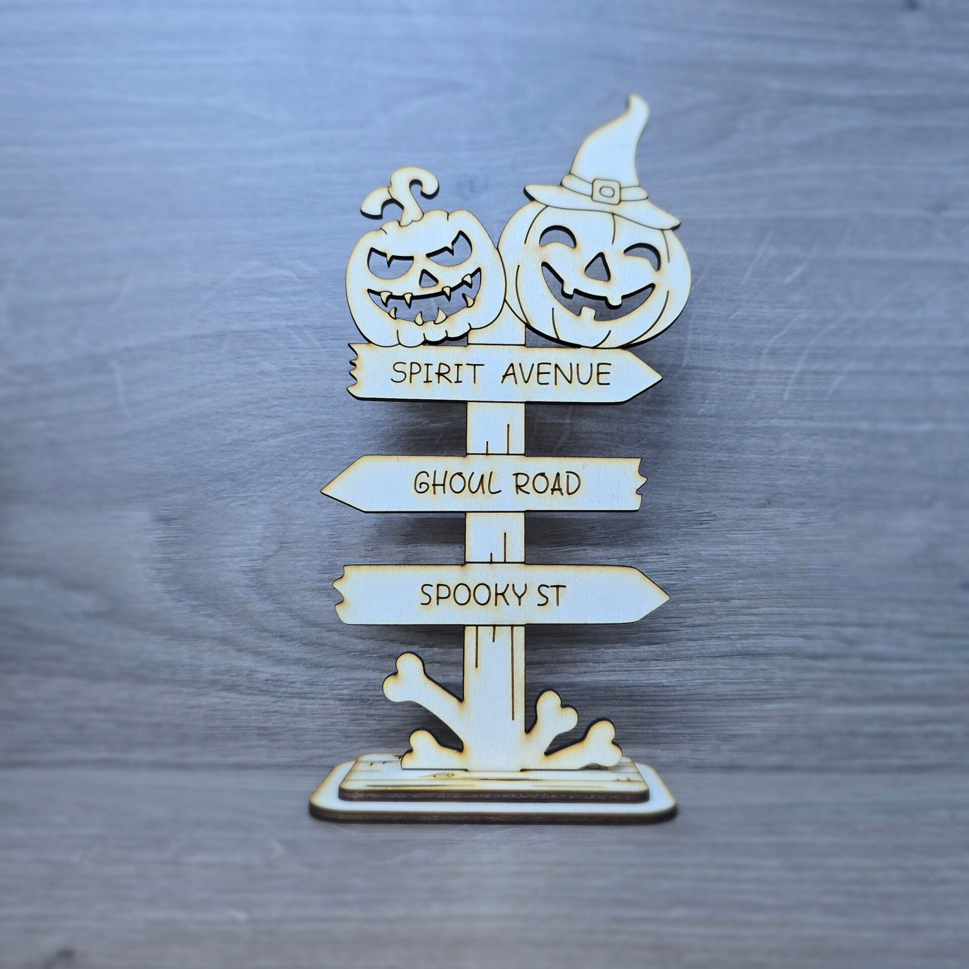 Add a touch of spooky charm to your Halloween decor with these laser-cut wooden Halloween sign posts! Featuring fun Halloween-themed street names like Spirit Avenue, Ghoul Road, Spooky St, Witches Ways, Dracula Place, and Pumpkin Drive, these decorative signs are perfect for creating a festive haunted house vibe.
